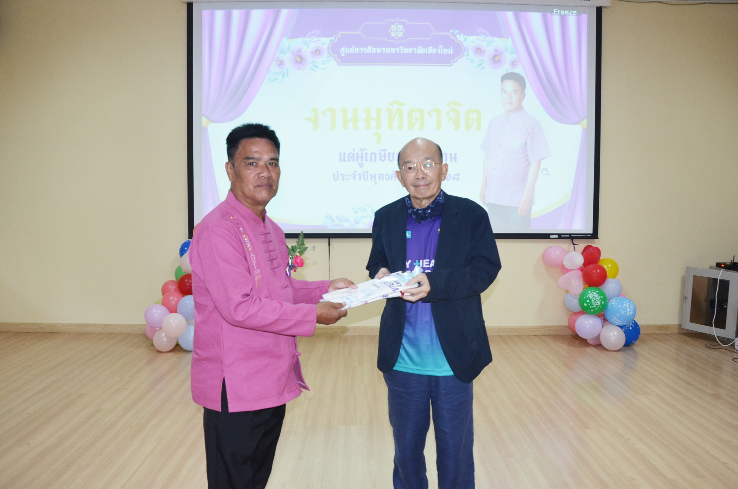 ศูนย์การศึกษามหาวิทยาลัยเชียงใหม่ จัดงานมุทิตาจิตแก่ นายทองสุข ปันสัก พนักงานบริการทั่วไป ศูนย์การศึกษามหาวิทยาลัยเชียงใหม่ ในโอกาสเกษียณอายุงานประจำปี 2568 โดยมีรองศาสตราจารย์ ดร.ประโยชน์ อุนจะนำ ผู้อำนวยการศูนย์การศึกษามหาวิทยาลัยเชียงใหม่ เป็นประธานกล่าวเชิดชูเกียรติและระลึกถึงคุณงามความดี ที่ได้อุทิศตนปฏิบัติหน้าที่ด้วยแรงกาย แรงใจ มีความมานะ อุตสาหะ พากเพียรพยายาม มุ่งมั่นสรรค์สร้างและพัฒนามหาวิทยาลัยเชียงใหม่ตลอดมา เมื่อวันที่ 16 กันยายน 2568 ณ ศูนย์การศึกษามหาวิทยาลัยเชียงใหม่ อำเภอเมือง จังหวัดลำพูน