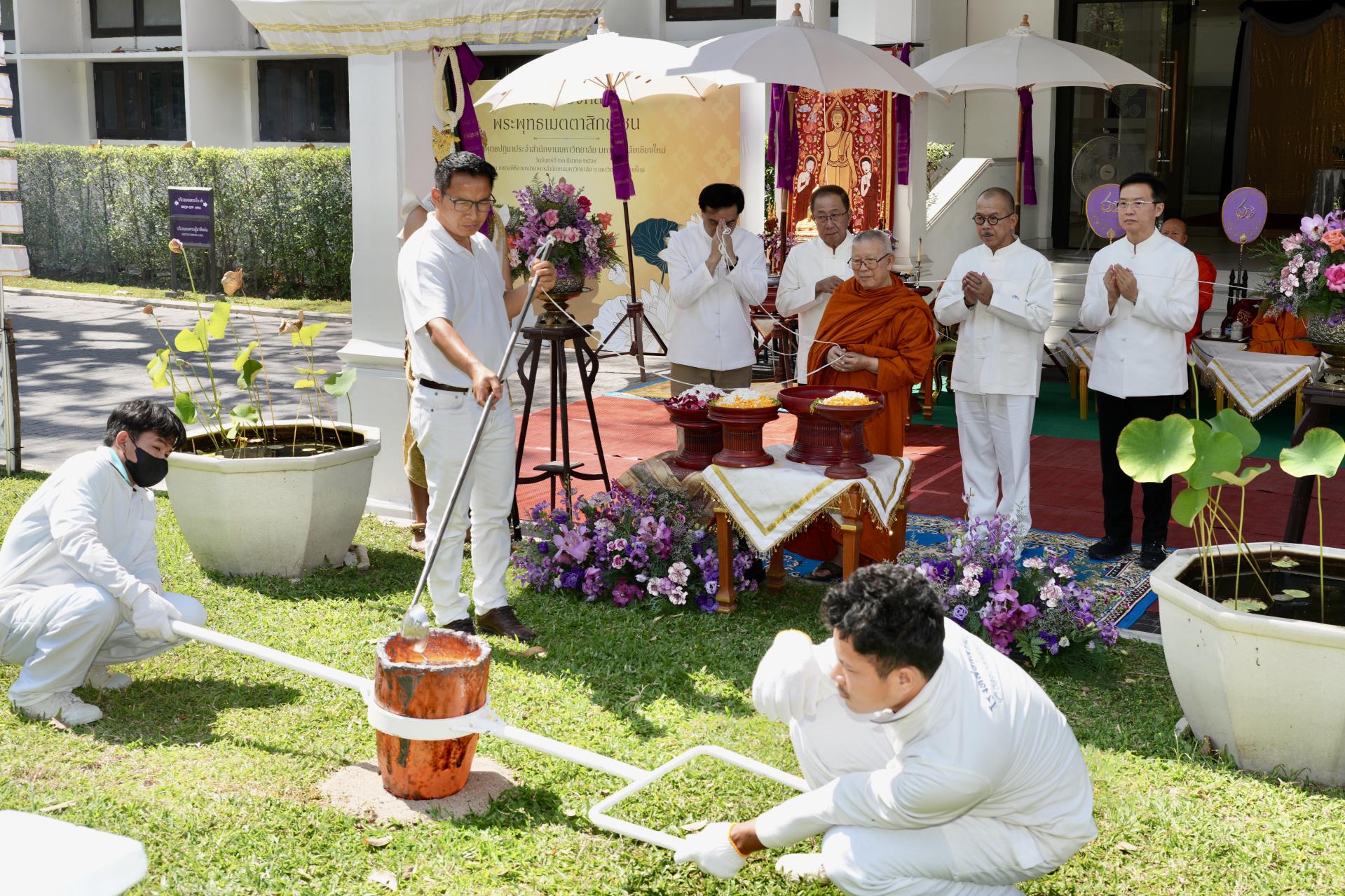 มหาวิทยาลัยเชียงใหม่ จัดพิธีเททองหล่อพระพุทธปฏิมา "พระพุทธเมตตาสิกขาชน" พระพุทธรูปประจำสำนักงานมหาวิทยาลัย ซึ่งเป็นพุทธศิลป์แบบล้านนา ปางมารวิชัย หล่อด้วยโลหะสำริดปิดทองคำแท้ โดยได้รับเมตตาจาก พระเทพปริยัติ ที่ปรึกษาเจ้าคณะภาค 7 และเจ้าอาวาสวัดเจ็ดยอด พระอารามหลวง เป็นประธานฝ่ายสงฆ์ และ ศาสตราจารย์ปฏิบัติ ดร.ชรินทร์ เตชะพันธุ์ รองอธิการบดีมหาวิทยาลัยเชียงใหม่ เป็นประธานในพิธีฯ พร้อมด้วยคณะผู้บริหาร โดยมี รองศาสตราจารย์ ดร.ประโยชน์ อุนจะนำ ผู้อำนวยการศูนย์การศึกษามหาวิทยาลัยเชียงใหม่ และบุคลากรเข้าร่วมพิธี เมื่อวันที่ 23 มีนาคม 2569 ณ มณฑลพิธีลานหน้าอาคารสำนักงานมหาวิทยาลัย 1 มหาวิทยาลัยเชียงใหม่ ทั้งนี้ พระพุทธปฏิมาดังกล่าวจะอัญเชิญไปประดิษฐาน ณ โถงพระ ชั้น 2 สำนักงานมหาวิทยาลัย เพื่อเป็นศูนย์รวมจิตใจของมหาวิทยาลัยเชียงใหม่สืบไป